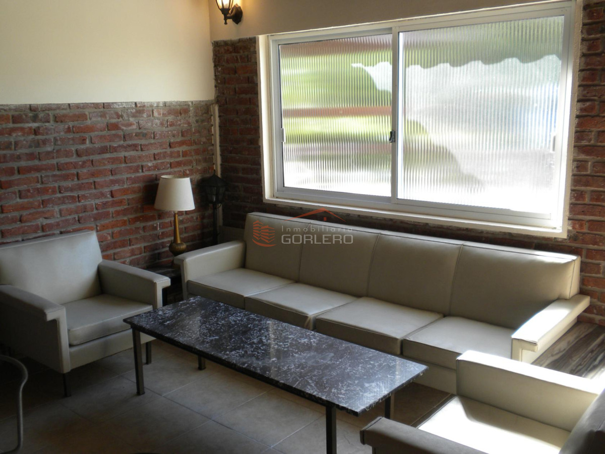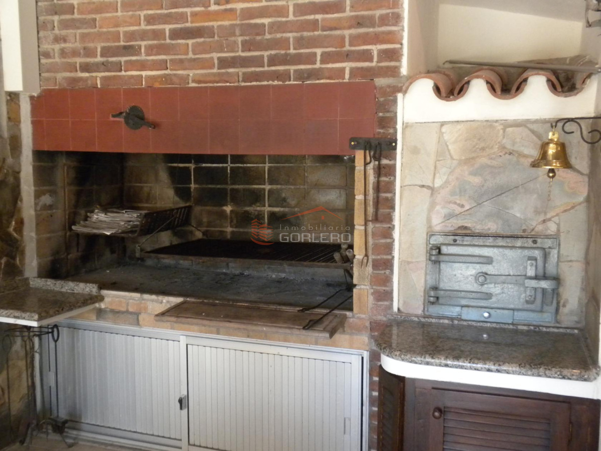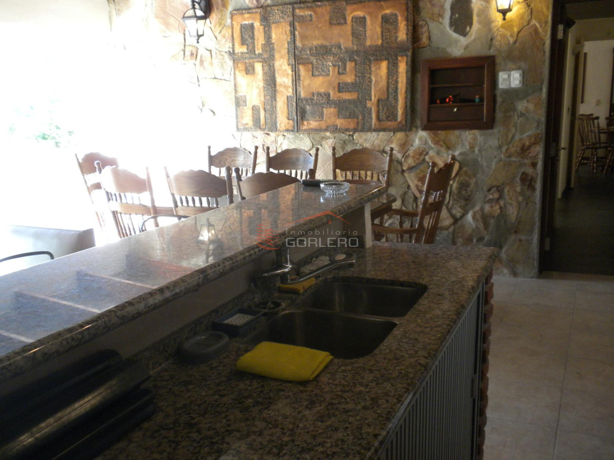 - Parrillero techado y cerrado: con living (un sillón grande de cuatro cuerpos y mesa ratona ), dos sillones de un cuerpo cu, comedor (mesa oval de madera con vidrio y ocho sillas) y mesada de granito con 4 bancos giratorios.